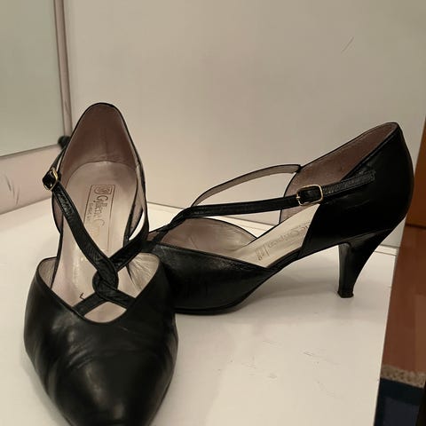 Finskor i brun färg tillverkade av skinn. Skorna är i storlek 38 och har en låg klack. De har en öppen tå-design med perforerade detaljer på ovansidan. Skorna är lämpliga för formella tillfällen eller vardagsbruk.