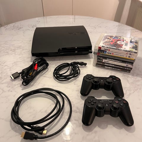 PS 3 med två handkontroller och19 spel. Var ett tag sedan spelen testades så kan inte garantera att alla är repfria osv, men konsoll och kontroller funkar som de ska