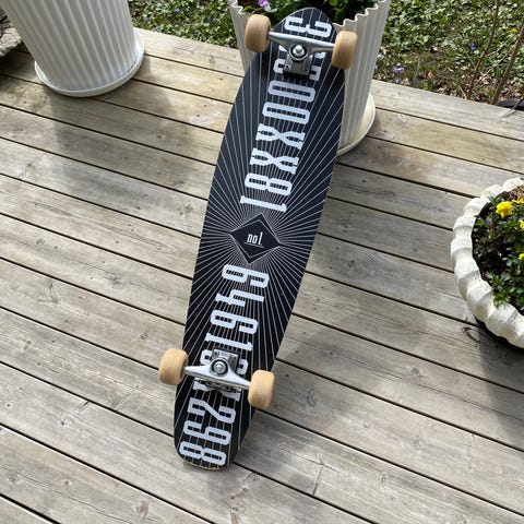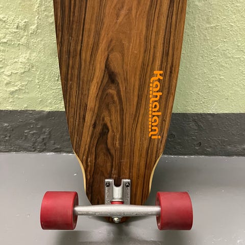 Kahalani Longboard Skateboard med träplatta och lila hjul. Hjulstorlek är 75 mm med hårdhet 78A. Passar för allmän användning inom skateboarding.
