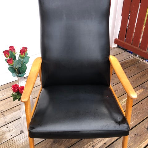 Vintage fåtölj i svart läder med träarmstöd och ben