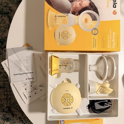Medela Swing elektrisk bröstpump inklusive flaskor, brösttrattar, strömadapter och förvaringspåse.
