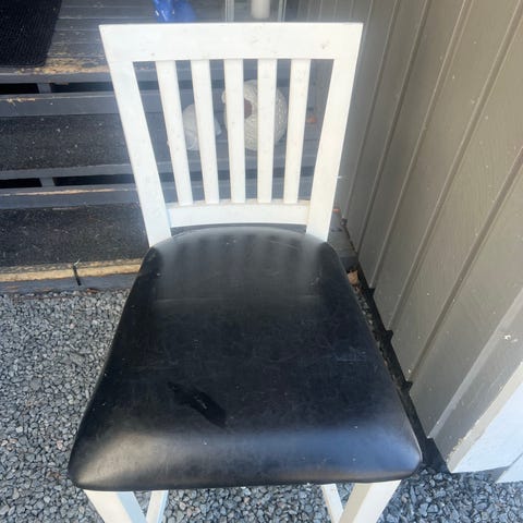 Två (2) stycken vita barstolar med svart konstläder. En sittdyna är trasig. Träslaget vet vi ej men stolarna är rejäla och inga IKEA stolar ( ek?). Dynorna måste kläs om och eventuellt också måste stolarna målas om. Stolarna kostar 150 kr/ st dvs. totalt pris är 300 kr för båda stolarna