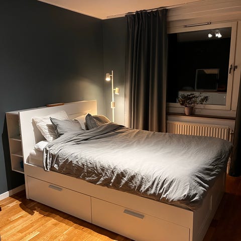 Pga flytt till lägenhet säljer jag denna säng +byrå. Sängen är från Ikea med bäddmadrass. På den ligger en tempurmadrass som är fast. Bredd 140 cm . Byrån är 80x48x78. Märke Malm.
