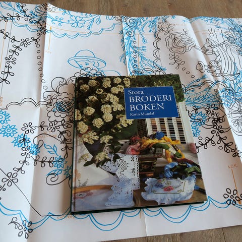 Prismas Broderibok - Med 100 teckningar och 50 färgfoton. Medföljer oanvänt separat påpressbart kopieringsmönstret med näckrosalfabet, Sanna E. Dammann. Utgiven 1982, 128 sidor. Nyskick. 100:-. Skickas ej, finns att hämta i Helsingborg.