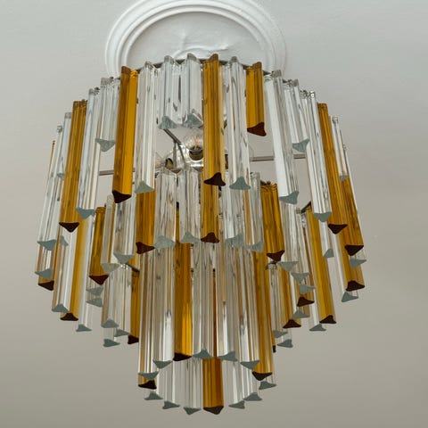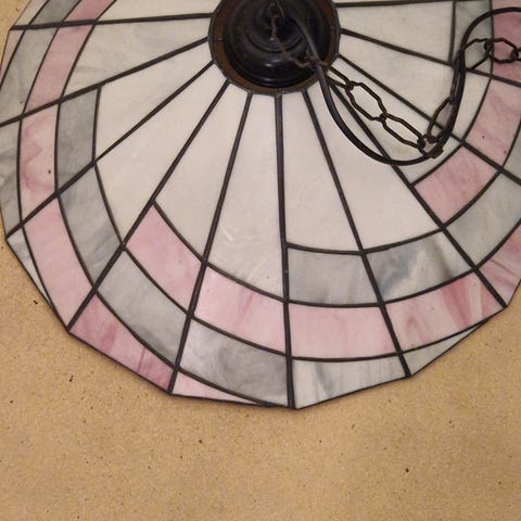 På bild 7 syns dekorativa detaljer i glas med inristade mönster, till vänster är det mönstret på den stora lampan, till höger- på dem små, glasprismor (i mitten) är likadana. Små prismor som sitter högst upp på den stora lampan är i plast.