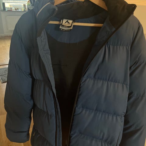 Mörkblå jacka med huva och dragkedja framtill. Jackan har detaljer som en ficka med dragkedja på bröstet och reflexdetaljer på ärmen och baksidan.