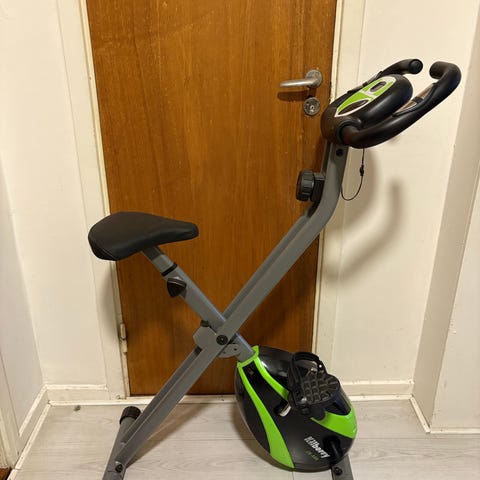 Gedigen justerbar träningcykel. Tung kvalitet, men lättmanövrerad med dom två transporthjul.