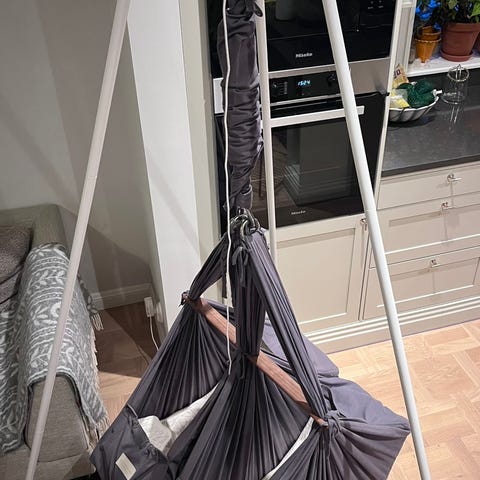 Använd av mina tvillingar,köpte helt nya ,rena hela,fins en liten slitage bara på gardinen som ska hänga framför bebisen ,följer två fjäder för olika vikt ,