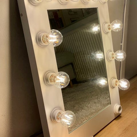 Sminkspegel från Vida xl. Satt tidigare ihop med ett sminkbord. Vitt ljus som lyser bra så sminket syns.
