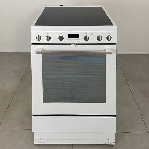 Snygg vit Electrolux-spis med glaskeramikhäll och varmluftsugn. Perfekt när du vill ha lite extra bredd på spisen och en stor ugn med bra överblick.