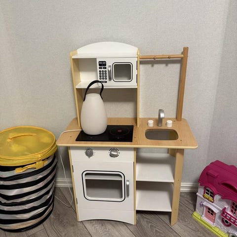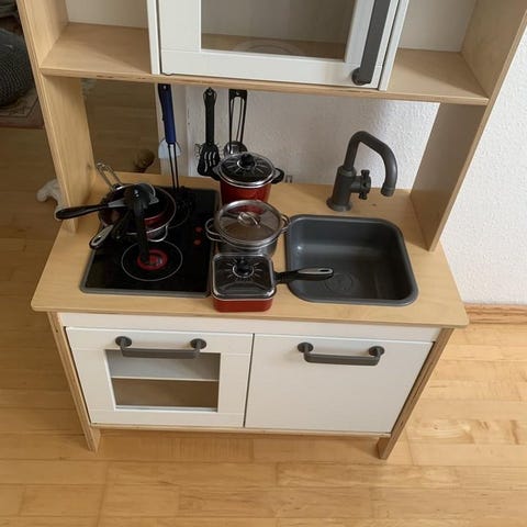 Ugn, vask, kran, två plattor och två vridbara knappar. Perfekt gåva som underhåller barnen i flera timmar.