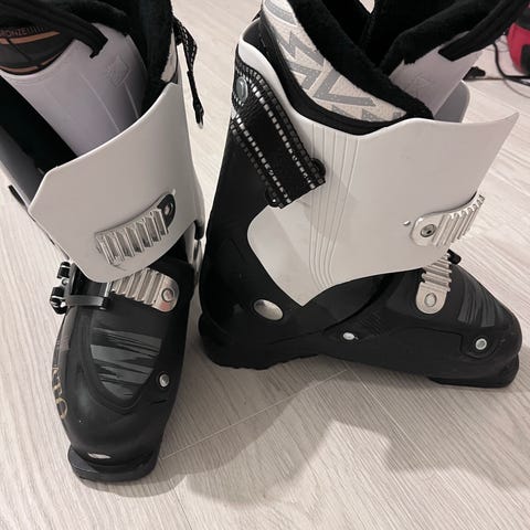 skidpjäxor i storlek 265 mm. Färg: vit med oranga och svarta detaljer. Pjäxorna har flera spännen för justering och är avsedda för skidåkning. Strl 40 42