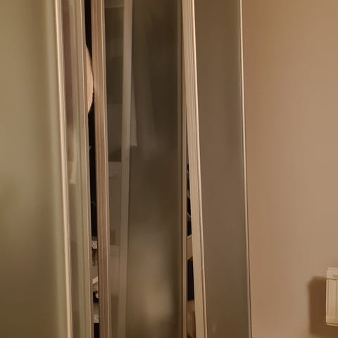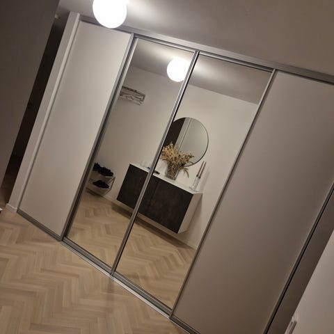 Måttbeställda skjutdörrar Mirro 2 st, vita med silverram, mjukstängande. Säljes då vi flyttat in i en nyproducerad lägenhet där vi ersatt dessa med spegeldörrar. Mått där de suttit 2500x1260 mm (en dörr mått 2500x 64)