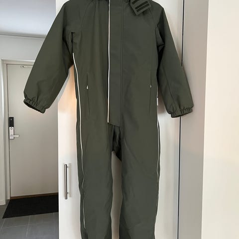 Reima vinteroverall i storlek 104. Overallen har förstärkta partier på knän och bakdel. Den har elastiska muddar vid ärmslut och benslut, finns även kardborre och dragkedja vid bensluten samt fotband för att hålla overallen på plats, dessa är utbytta.
