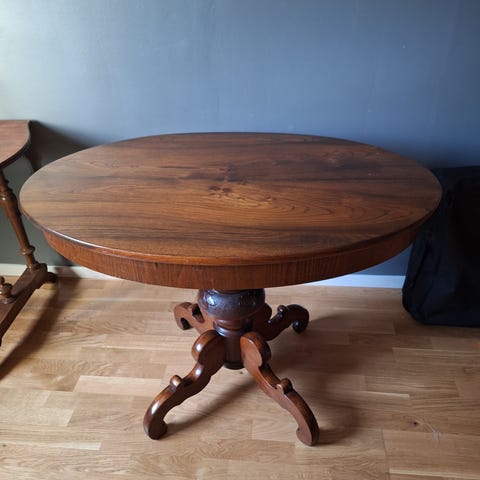 Antikt Pelarbord runt träbord med en höjd på 56 cm. Passar som sidobord eller dekorativt möbel i olika rum.