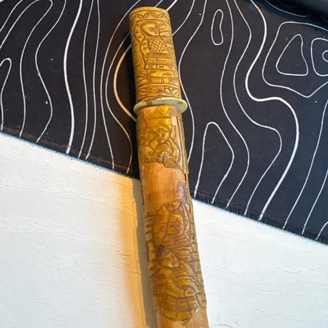 Mosaikdamask blad av Gregory Verijnikov och skaftet är mammutbete, stabiliserad björkvrill och tenn.Kniven gjort av Ingemar Bertilsson.Helt oanvänd och i ny skick