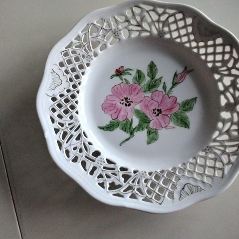 Fatet är dekorerat med traditionella motiv som blommande grenar, pioner och naturinslag. Penseldragen är mjuka och vackert skuggade, vilket ger ett harmoniskt och tidlöst uttryck.