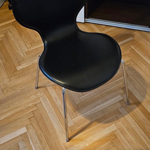 Två stolar i svart konstläder, benen är i stål. Styckpris 500 kronor