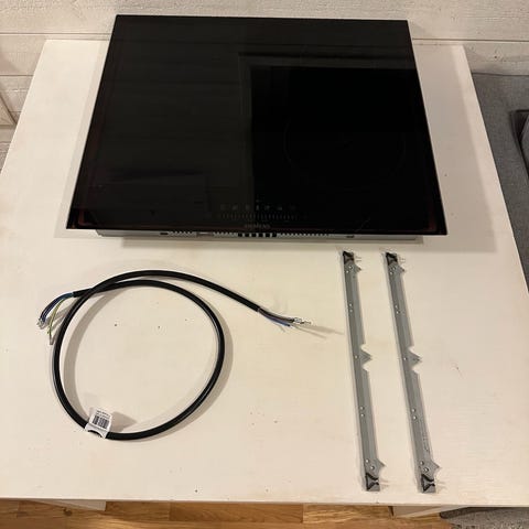 Oanvänd Cylinda spishäll med induktionsteknik, svart färg, spänning 230 V, effekt 7200 W, fyra zoner. Mått: bredd 770 mm, djup 510 mm, höjd 54 mm. Vikt 11 kg.