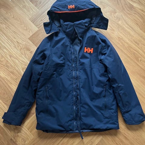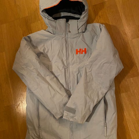 Helly Hansen jacka och skidbyxor i svart färg, storlek 164 för pojke. Jackan har huva och dragkedja framtill, samt reflexdetaljer på ärmarna. Byxorna har hängslen och en ficka med dragkedja på ena benet. Materialet är anpassat för utomhusaktiviteter och skidåkning.