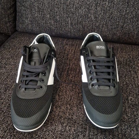 Hugo Boss Sneakers i storlek 45 för herrar. Skorna är svarta och tillverkade med material som kombinerar mesh och syntet för andningsförmåga och hållbarhet.