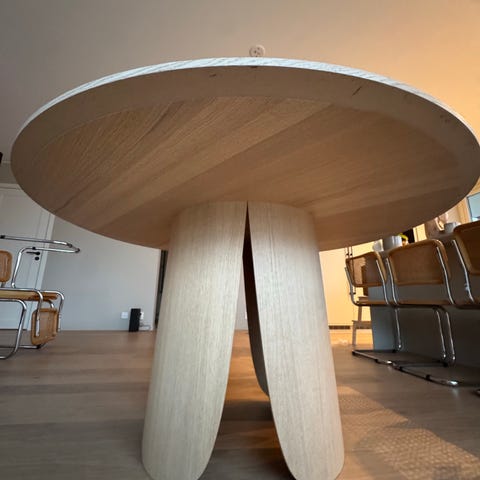 Helt nytt runt matbord i kartong från Bolia. Brun marmorskiva samt underrede och ben i massiv rökt ek.
