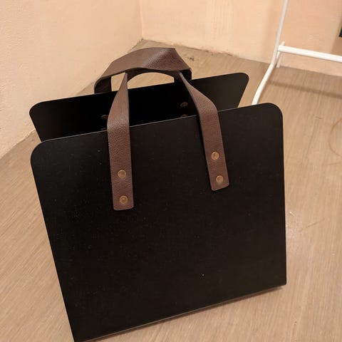 Vedkorg i svart metall med böjda handtag och dekorativa detaljer. Passar för förvaring av ved inomhus. Robust konstruktion med en böjd form för enkel hantering. Finns i Enköping 0705955800