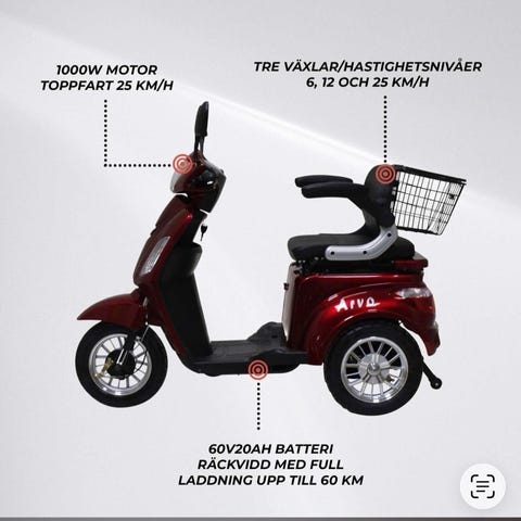 Växlar: 3 växlar 12, 20 och 25 km/h Batteri: 60V20AH Max räckvidd: 60 km (max räckvidd varierar beroende på förarens vikt, terräng, väder etc.)