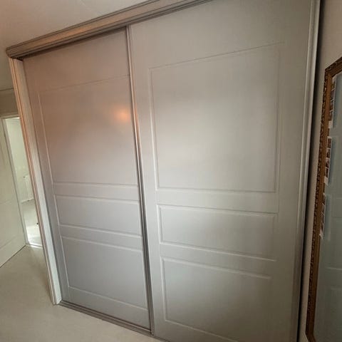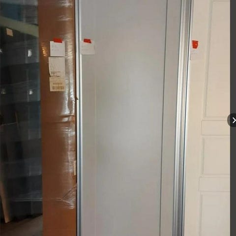 Vit skjutdörr med tillhörande skena. Några fläckar och småskav. 72 cm bred. Hämtas i Falun