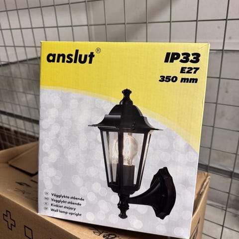 Svart väggmonterad utomhuslykta tillverkad i metall. Passar för utomhusbruk och kan monteras på vägg. Färg: svart. Material: metall. Klart glas. Finns i Enköping 0705955800