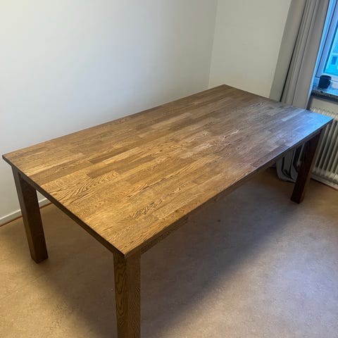 Matbord i massiv ek och underrede+ben i metall. Skivan är limmad i långa stavar så inga skarvar på längden alltså!