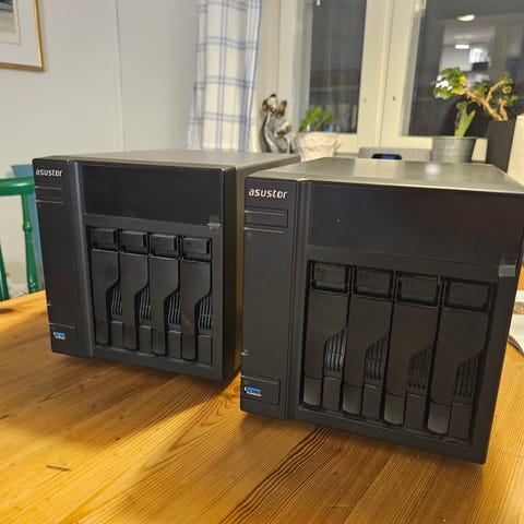 Synology DiskStation NAS-enhet med 4-bay konfiguration, utrustad med fyra 3TB hårddiskar (totalt 12TB). Enheten är svart och har flera anslutningar inklusive USB-portar och nätverksportar. Systemet visar hälsostatus för varje hårddisk och är avsedd för datalagring och säkerhetskopiering.