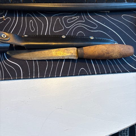 Tora Kukri kniv med svart handtag och svart slida. Kniven har en böjd bladdesign typisk för kukri, vilket gör den lämplig för olika skär- och hugguppgifter. Bladet är ca 37 cm och av 5160 fjäderstål om jag minns rätt. Handtaget är ergonomiskt utformat för greppkomfort. Slidan är tillverkad av svart läder och har en rem för fäste. Passar för utomhusbruk och samling. 1100kr