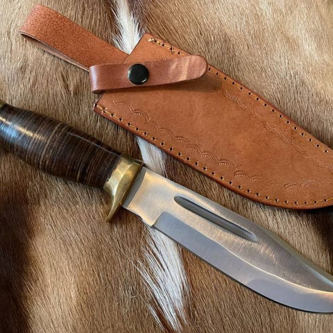 Bowie kniven går under namnet Sable Bowie. Bladet ca 27 cm och av rostfritt stål. Handtag av trä med mässingsdetaljer. Slidan är av brunt läder. 600kr