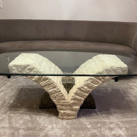 Soffbord bestående av två bord med glasskiva i marmorimitation.