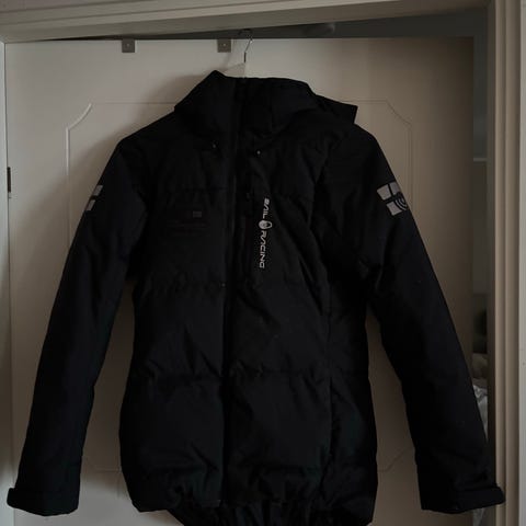 -Ytterplagget är avsett för utomhusbruk och har en huva med pälsliknande kant. Jackan har flera fickor och knäppning framtill.