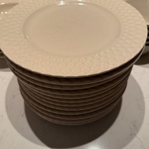Servis serien Clover. Inkluderar tallrikar, skålar och en kanna. Tål maskindisk och mikrovågsugn. Köpta på hemtext.