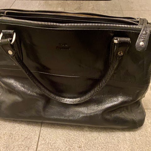 Svart axelremsväska, märke TheMonte, helskinn. Helt oanvänd. Nypris 599 kr. Ett innerfack, två ytterfack. Samtliga fack m dragkedja. Mått: 22X15,5 cm.