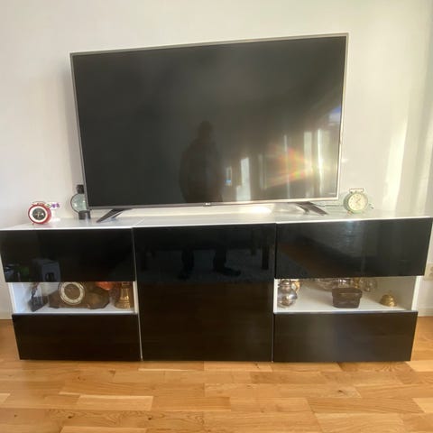Fin TV-bänk med öppen och stängd förvaring. Luckorna öppnas nedåt.