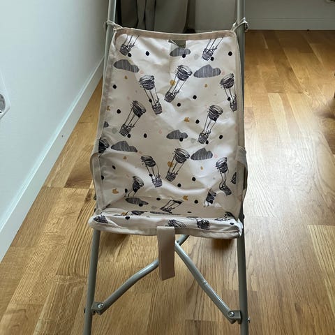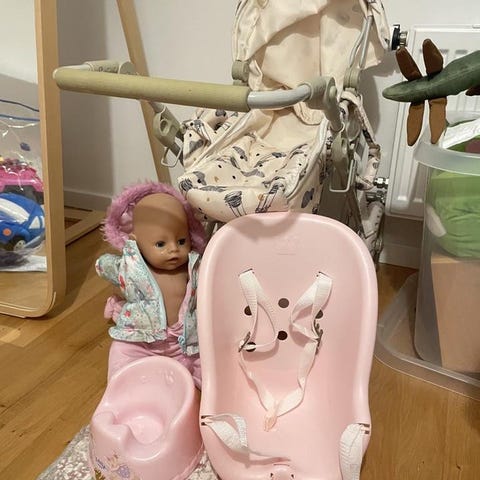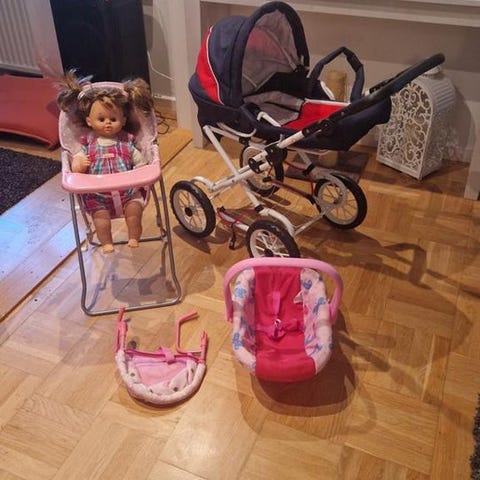 Säljer en Skrållan docka och barnvagn med liggdel och sittdel i bra skick, en del skav på handtaget till vagnen.