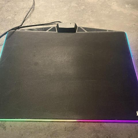 Stor svart gamingmusmatta med RGB-belysning runt kanten från Corsair. Passar för både mus och tangentbord och ger en jämn yta för spel och arbete. Har två USB uttag för mus mm