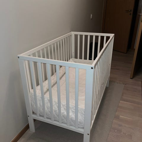 -Säljer en IKEA spjälsäng i grön färg, avsedd för barn. Sängen är tillverkad i trä och har en traditionell design med spjälor för säkerhet och ventilation. Passar för små barn och kan användas som barnsäng. Pris 700 kr.