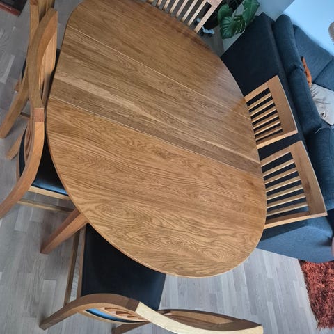 Vi säljer även sex robusta stolar i ek, nytapetserade stolsdynor, fint skick! (Stolarna har vi köpt separat, vet inte vem tillverkaren är men de är stabila och välskötta)