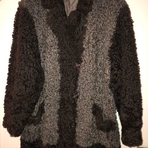 Snygg svart pälsjacka av äkta fårskinn. Knäpps med tre hyskor. Diskreta knappt synliga hällor för skärp finns, men skärp saknas. Annat svart läderskärp kan användas. Två infällda fickor. Figursydd och nätt. Uppskattad storlek 34/36. Längd 64 cm. Mörkblått foder. Jättefin men tyvärr för liten för mig.
