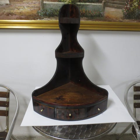 Handmålad hörnhylla i trä med dekorativa motiv från år 1812. Hyllan har en öppen övre del och en nedre del med dörr. Färgen är röd med detaljer i flera färger. Passar för förvaring och dekoration i hörn.
