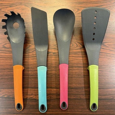 Praktiskt och snyggt redksapsset med många olika slevar från Joseph Joseph. Spaghettisleven har en liten brännskada men annars är alla slevar i fint skick. Pris: 50 kr.