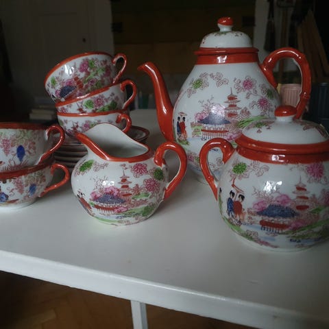 Kinesisk teservis. 10 koppar och 11 fat. Tekanna, sockerskål samt mjölkkanna. Kanske något för lekstugan?