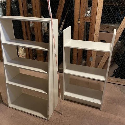 Tre snygga enkla trähyllor med vita konsoller i lite varierande skick, enkla att slipa eller måla.