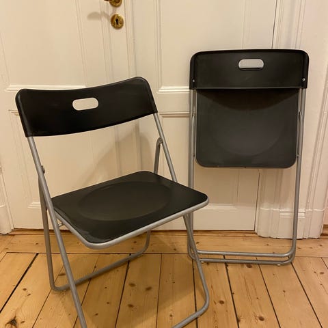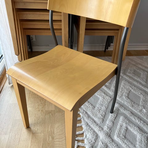 Tåliga stapelbara stolar i förstärkt propenplast. Sitthöjd 44cm