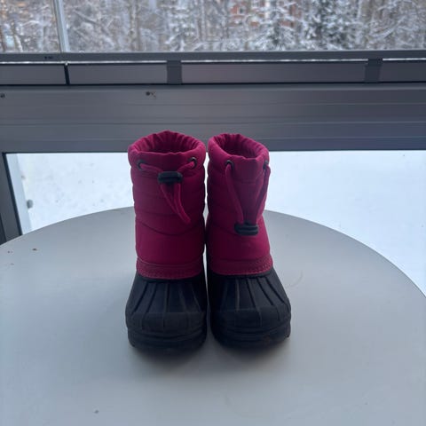 unisex barnstövlar i storlek 28. Stövlarna är svarta med ett mönster och har en varm, fodrad insida. De är avsedda för barn och lämpar sig för kallt väder.